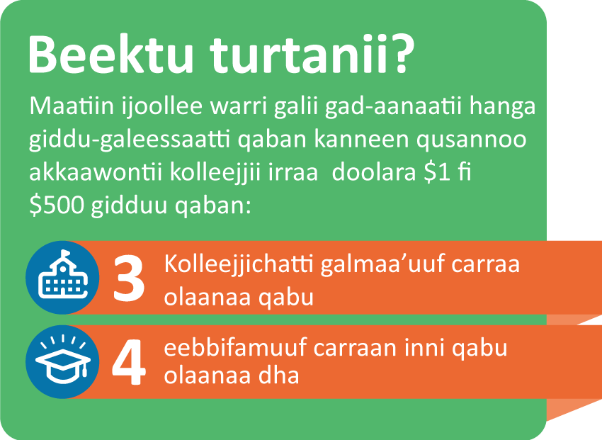 Carraa ijoollota isaanii isa gara fuula duraatiif yaadanii qusachuu fi karoorsuun maatiidhaaf ulfaataa ta’uu waan danda’uuf hawaasni walitti dhufuudhaan CollegeBound Sain Paul jedhamu qopheessuudhaan ijoollota isaaniitiif akka qusatanii fi akka karoorsan gargaaree jira. Barnoota ijoollee keessaniitiif amma irraa jalqabuun qusachuu fi karoorsuu eegaluun kan yeroo isaan umurii kolleejiitiif qophaa’aniitii wajjin garaa-garummaa guddaa qabaachuu danda’a.